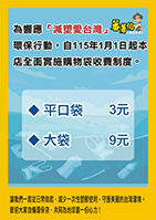 自115年1用1日起 ,購物請自備購物袋,或選擇自費購物袋,謝謝 !